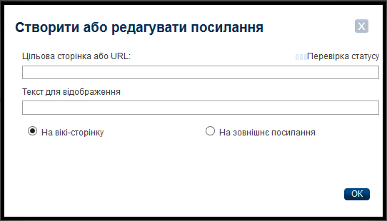 Наприклад, для статті з назвою «Івано-Франківськ» (відобразиться за замовчуванням) можна вказати просто «Франківськ». - Переконавшись, що Ви ввели правильні дані, натисніть «ОК» для створення посилання.