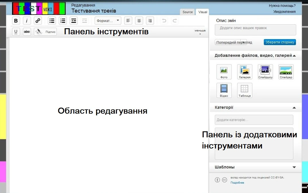 - Коли Ви натиснете кнопку "Редагувати", завантажиться наш Візуальний текстовий редактор. В ньому можна редагувати текст і вставляти зображення. Але Ви можете переключитися в режим вікітексту, використовуючи вкладку зверху редактора.
